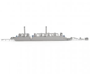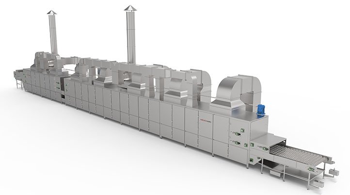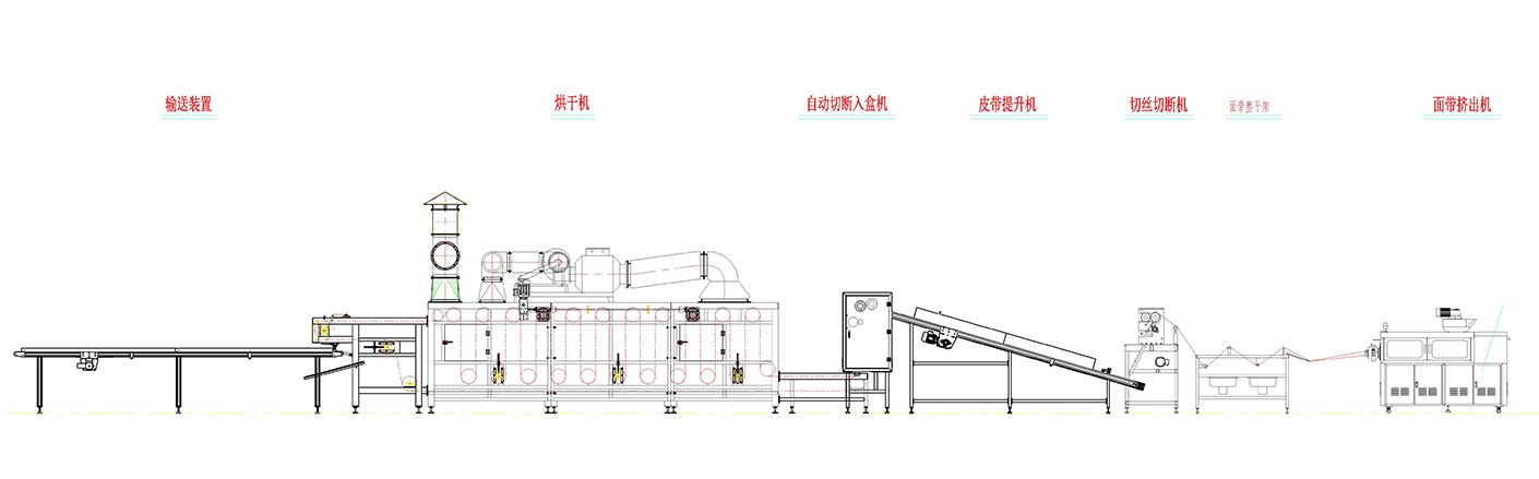 概要信息:生產線從面帶擠出、面帶整平、切絲成型、面條提升、切斷入盒、烘干、輸送的全線自動化生產。