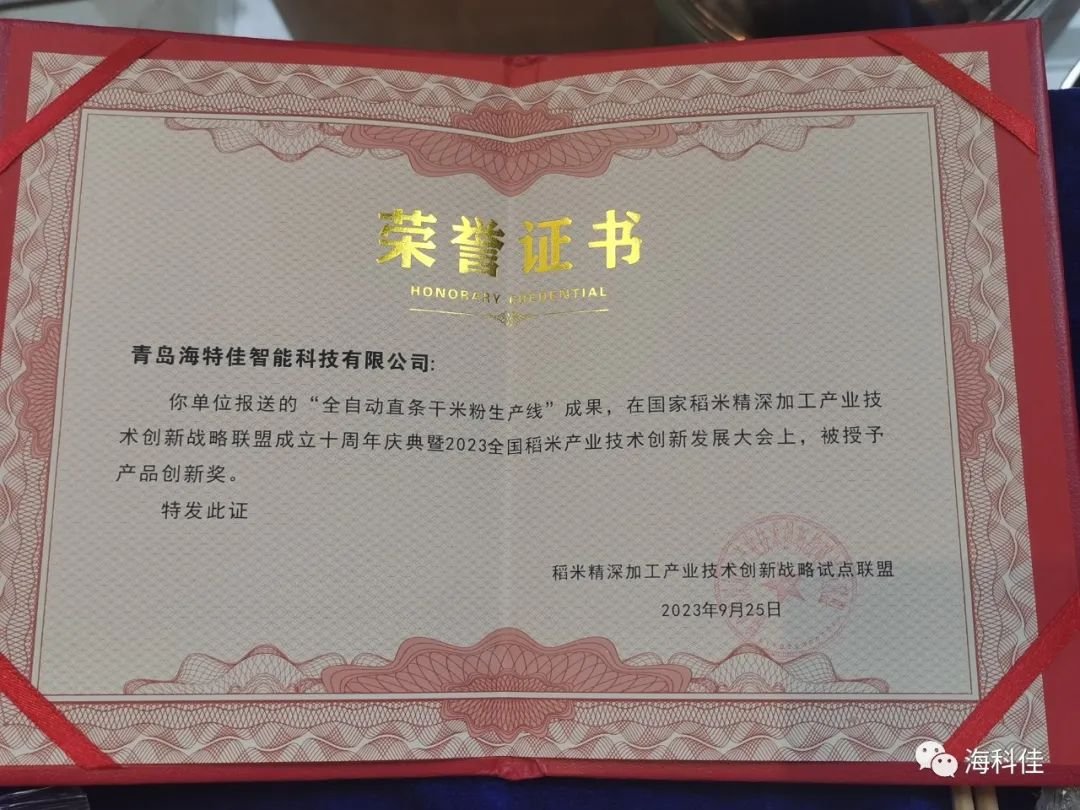 9月24日至26日,國家稻米精深加工產業技術創新戰略聯盟成立十周年慶典暨2023創新發展大會在湖北武漢舉辦。本次大會以“十年‘稻’路,創新未來”為主題,匯集了中國科學院院士張啟發,中國工程院院士孫寶國、張洪程、胡培松等專家,以及300多位稻米全產業鏈的專家學者、企業代表共同出席會議共同探討稻米精深加工產業技術創新發展青島海科佳“全自動直條米粉生產線”獲得各位專家評委的好評,在本次大會上榮獲“創新產品獎”,并作題為《米粉智能化裝備的發展與行業變革》的專題報告。