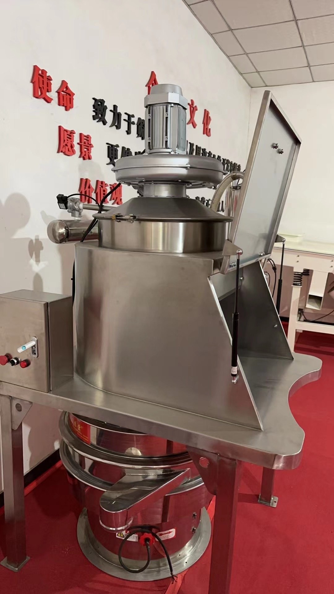 3)風機底座與投料倉上部為法蘭螺栓快拆聯接,在更換濾芯時,要移開風機及風機座,在更換篩網或維護修理時,·好把風機及風機座從投料倉上部移開,以減少投料倉上部的重量,便于氣彈簧打開、安全可靠。
